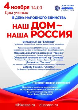 4 ноября в 14:00 в Доме учёных Новосибирского Академгородка состоится концерт "НАШ ДОМ-НАША РОССИЯ". В программе выступление вокальных коллективов. Приходите! Все средства от концерта будут перечислены на СВО (57 мотострелковому полку).